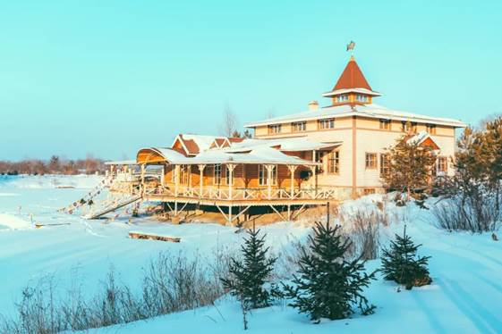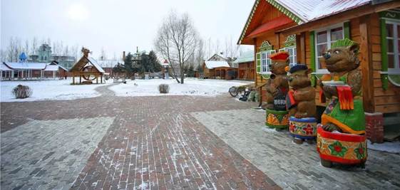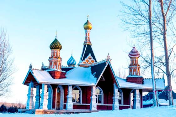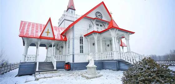 这是一个俄式建筑的庄园,里面所有房子都是木质的。圣尼古拉斯教堂、彼得洛夫艺术宫、普希金沙龙、伏特加酒堡…… 俄式建筑本身色彩就很丰富,积雪一压,说是在俄罗斯拍的也没什么破绽。