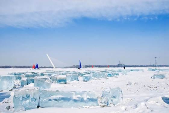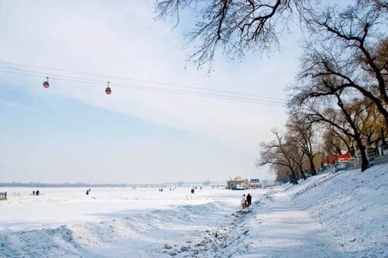 沿着中央大街一直走到头,冻得分不清哪里是岸哪里是水面,这就是松花江了。