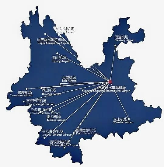 铁路不够,航线来补。云南省内机场有十来个,基本覆盖了所有市和自治州。所以想跑远点不用担心坐车坐铁路太久,就算没直飞,通过昆明转个机就行。
