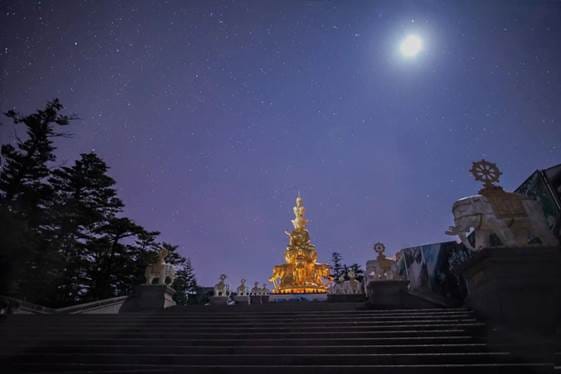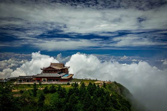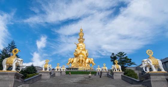 金顶的舍身崖是“壁立千仞”的直观表达;华藏寺则能让人感受到“佛要金装”的华丽。