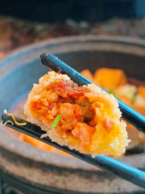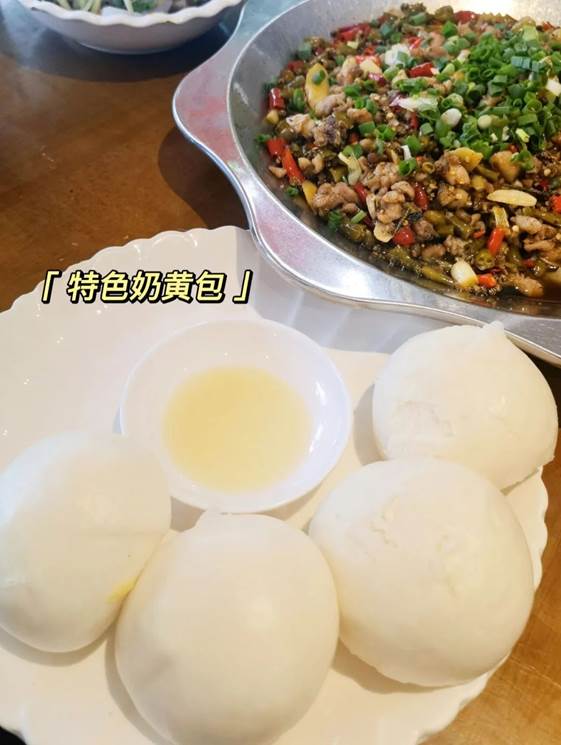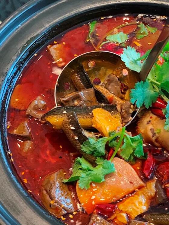 在满满一盆泡椒、藤椒、豇豆的配菜加持下,兔子肉口感很滑嫩,而且完全吸收了双椒让人嘴巴冒火的辣度,额头滋汗那还是轻的,嘴唇要发麻好一阵子,配奶黄包或者冰糖南瓜汤才解辣。