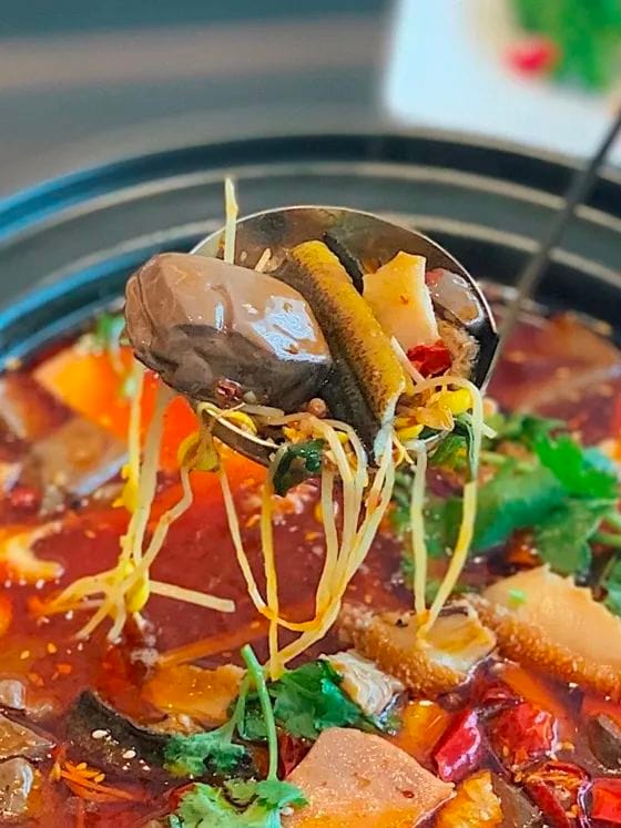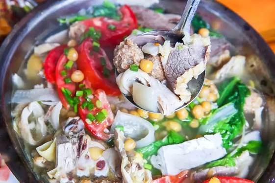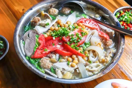 漂汤是眉山彭山的特产,叫漂汤但重点不是汤,而是把一堆食材放在用土鸡和棒子骨熬成的高汤里煮,有那么点不辣版冒菜的感觉。