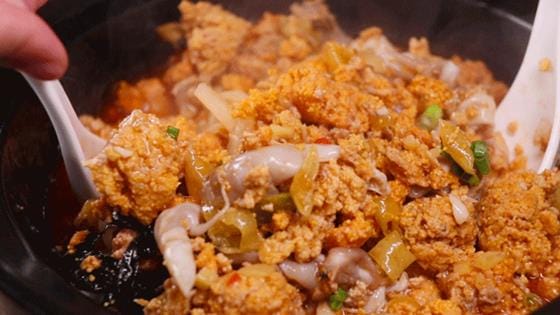 鸡肉有很重的糊辣壳味,回味上来的辣味也不呛嗓子,平时吃得惯辣的人大概会觉得特别香。