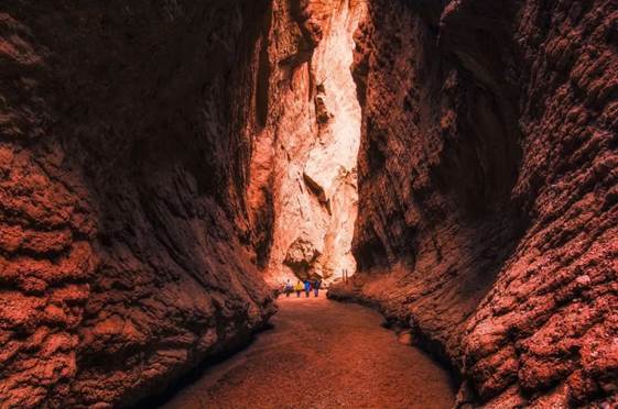 峡谷狭窄,车是开不进去的。在这里可以明显地看到峡谷侧壁上不同的褶曲和断裂线,血红色的山体高高耸立,直插云霄,身在其中,不得不感慨大自然的鬼斧神工。有了它,还去什么美国科罗拉多州大峡谷。