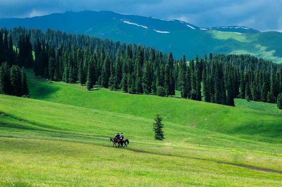 喀拉峻草原被称作“草原之王”,辽阔的草原上点缀着一朵朵小野花,连接着远处遍布云杉叠层起伏的雪山,风景非常原生态,也很值得一去。